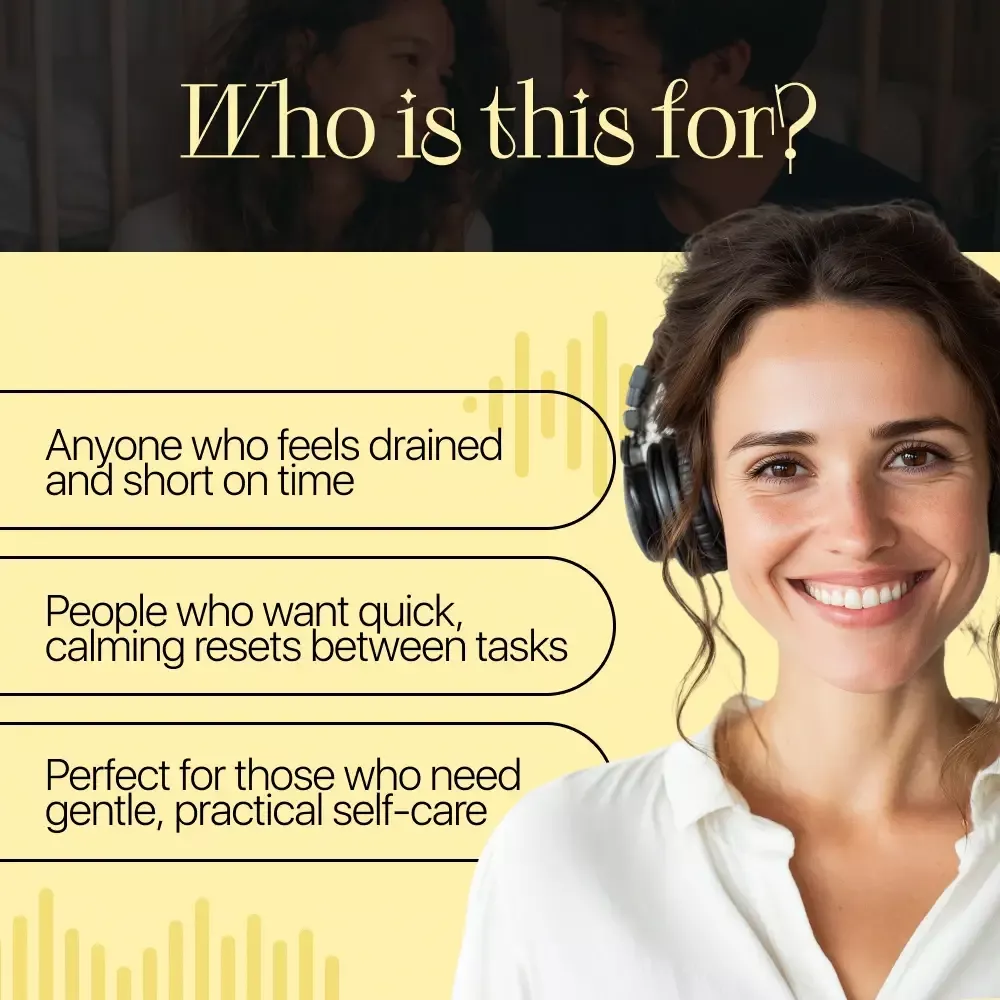 Parents who feel stretched thin and need relief they can actually use. Caregivers who want quick, calming tools between tasks and bedtime routines. Anyone who prefers gentle, practical audio coaching over complicated programs.