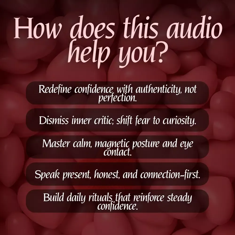 Build Unshakable Confidence for Dating in 5 Days is a guided Audio experience that helps you feel calm, authentic, and attractive in real-life conversations—without scripts or gimmicks. Across five focused days, you’ll listen, reflect, and practice simple shifts that quiet the inner critic, steady your body language, and unlock genuine presence. The result is confidence that feels natural, not performative. Confidence isn’t about being the boldest or most charming person in the room—it’s about being secure in who you are. If you’re ready to stop overthinking and start connecting, this digital download gives you a clear, compassionate path forward.
