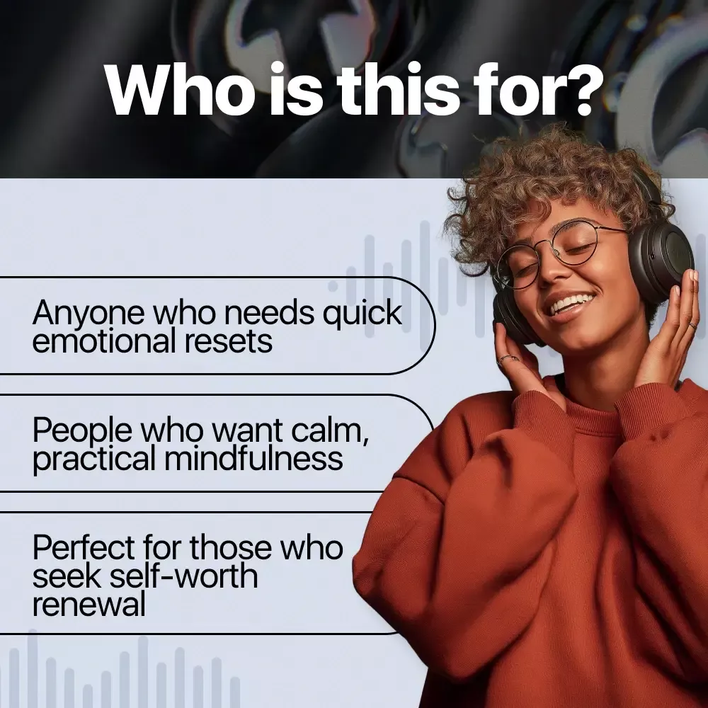 Anyone craving a kinder inner voice and a steady sense of worth. People who want simple, soothing meditations they can fit into busy mornings, mindful breaks, or bedtime. Perfect for beginners and seasoned meditators who prefer practical guidance over complicated techniques.
